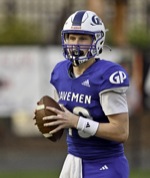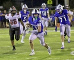 North Valley running back Gabe Dahlberg (22) outraces South Umpqua's Mason Johnson (6) and Rudolphe Vasquez (18) to the end zone in the third quarter to score the two teams' only touchdown of the game on Friday night in Merlin. North Valley won 6-3.