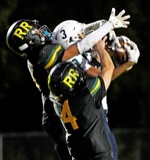 Rogue River's Gianni Gervasi (2) eludes Sam Soter (84) of St. Mary's on his way to a long touchdown run in the first quarter, Gervasi's second TD of the period, on Friday night at Chieftain Stadium. The Chieftains defeated the Crusaders 65-42.