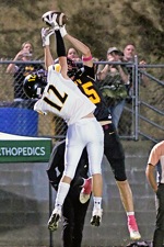 North Valley linebacker Caleb Garland (left) and defensive back Wyatt Bell (31) haul down South Umpqua receiver Josiah Garrison (center) during the second half on Friday night in Merlin. The Knights won 6-3.