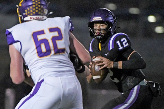 Cascade Christian quarterback Deryk Farmer looks downfield for a target during the Challengers' Class 3A football state championship game against Burns at Summit High School in Bend on Saturday night. Farmer completed 14 of 25 passes for 205 yards and two touchdowns as Cascade Christian prevailed 35-28 over the Hilanders for the Challengers' third state crown in four years.
