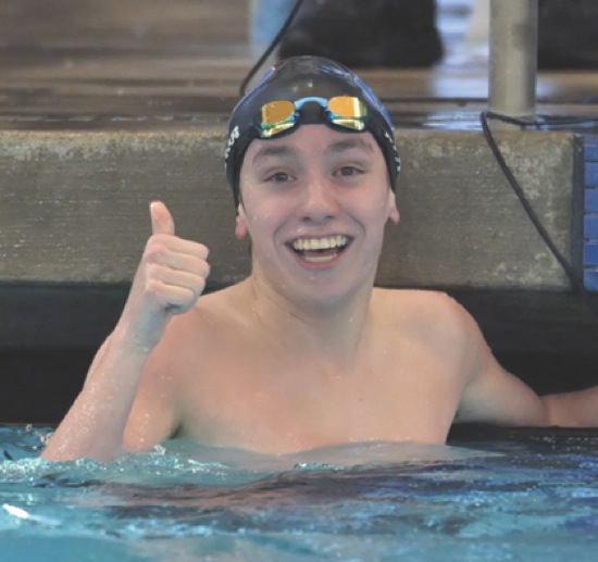 Ethan Blair gives the thumbs up after his win in the boys 100 breaststroke